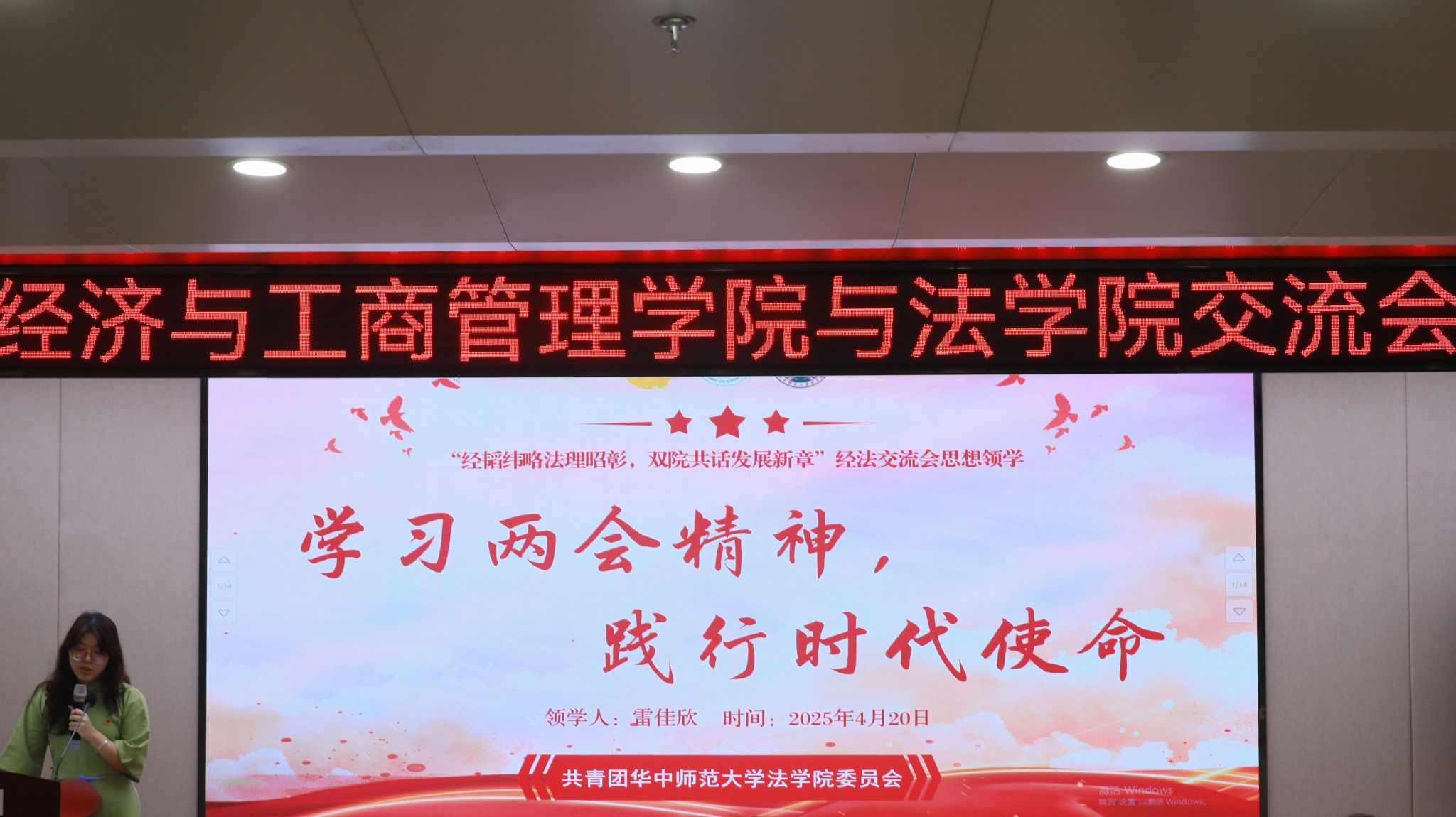 “全体交流”环节伊始,法学院本科生团总支组织部成员雷佳欣领学“两会精神”相关理论。雷佳欣系统梳理了2024年全国两会核心文件,通过理论阐释与案例分析相结合的方式,深入解读“两会精神”的核心要义,并着重阐述了“两会精神”与新时代法治实践和社会发展的内在联系,有效提升了与会同学的政治理论素养和现实关切意识。