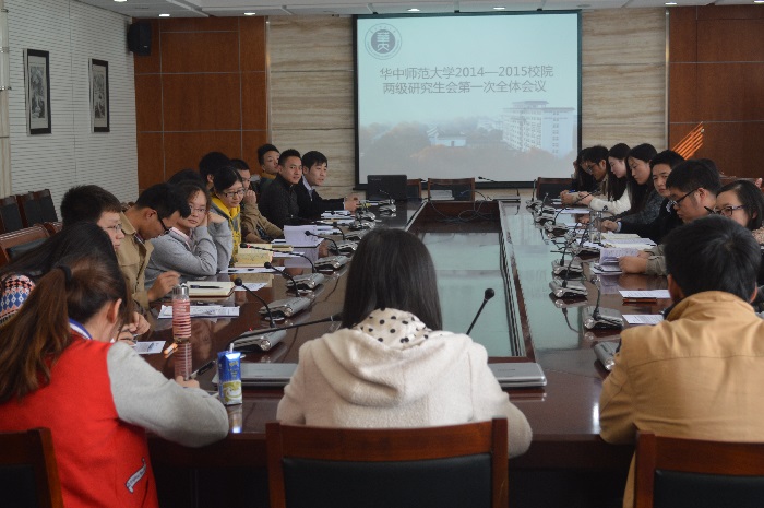 华大青年讯2014年11月4日中午,华中师范大学2014—2015校院两级研究生会第一次全体会议在科学会堂301会议室顺利举行。参加此次会议的有华中师范大学研究生会主席团、各部门部长以及来自23个学院的研究生会主席。本次会议由校研会主席叶云岭主持。