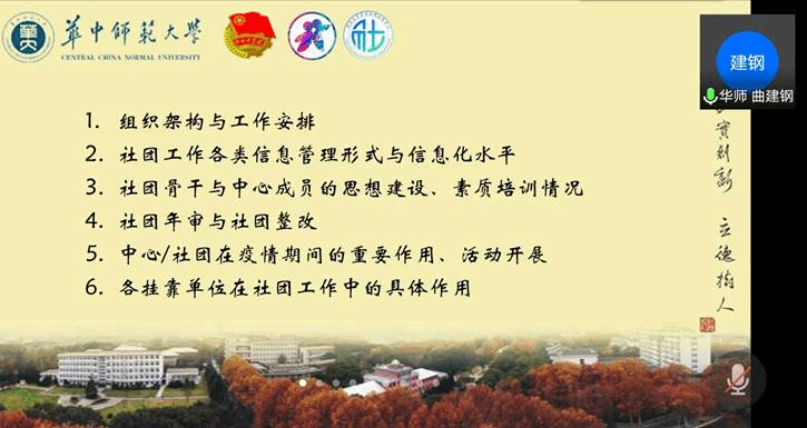 会议在双方社团指导中心主任分别介绍到场人员后拉开序幕。华师学生社团指导中心主任曲建钢以PPT的形式展示了本次发言的基本框架和会议流程,并且就第一部分组织架构与工作安排进行了介绍。华师学生社团指导中心活动管理部部长李淼同学在详细介绍我校社团指导中心如何开展社团信息收集、记录和备案之后,向武大参会同学提出如何更好地整合社团资源这一问题。接下来,华师学生社团指导中心秘书长李梦珂分享了社团骨干与中心成员的素质培训和社团年审整改的相关情况。学生社团指导中心活动管理部副部长王佳雯主要讲述中心/社团在疫情期间的重要作用和活动开展情况。最后社团联络部副部长贾亦真说明了各挂靠单位在社团工作中的具体作用,并提出如何加强与各挂靠单位联系这一问题作为后续交流内容。至此,华师学生社团指导中心介绍发言完毕。