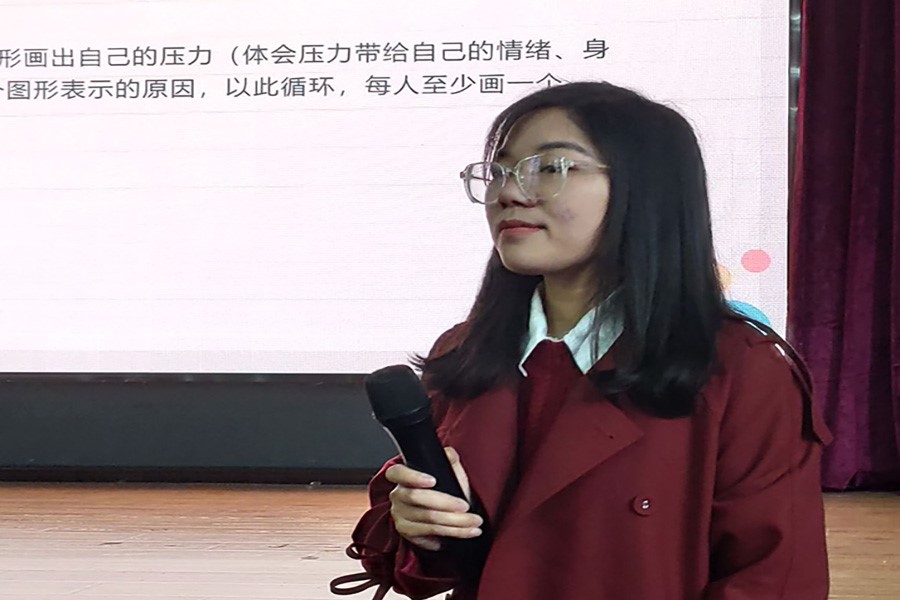 课程当中,各小组积极发言,展示自己。在第二部分的“画出你的压力”活动中,主讲人带领同学们体会压力的特点,感受压力的形状,鼓励小组成员在组长的带领下将压力画在纸上。在分享环节中,王昭作为第七小组的小组代表分享了该小组成员的压力形状。“小组成员中有用石头来形容压力的,当有压力时就像石头压在自己身上;有用蹲着的小男孩形容压力,表示压力来临时自己会蜷缩起来”。各小组积极讨论,课堂气氛浓烈。