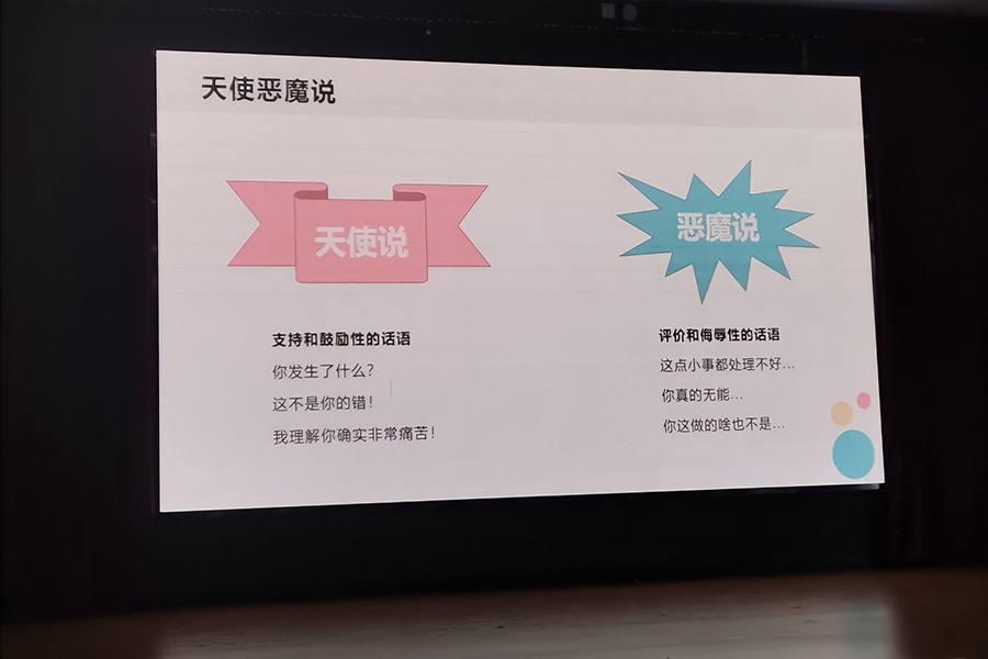 随后,同学们在舞台上开展“天使战恶魔——角色扮演”的活动,第三小组的喻腾玉、罗鹏宇、蒿玉如同学进行“在爱情中是否要卑微追求”的探讨,天使与恶魔的角色互相角逐、异常激烈。主讲人总结表示:无论是什么样式的压力,都需要直面压力,以勇敢的心态战胜压力!团队的凝聚力能够增强个体的信心,能够助力大家打破压力的枷锁。
