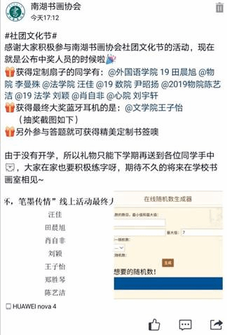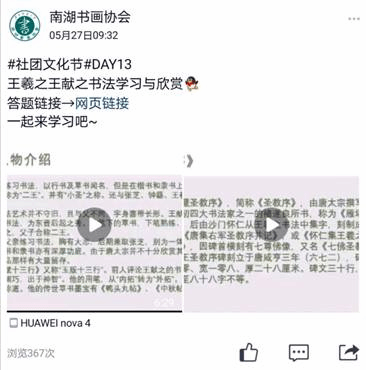 5月14日,南湖书画协会官方QQ在QQ空间社交平台上发布说说,介绍了此次南湖书画协会社团文化节的活动流程。新颖的活动方式得到了热烈反响,截止至5月16日,该说说的转发次数达到31次,浏览次数达到875次。