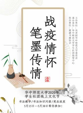 华大社团中心讯(通讯员 郑胜琴 王司睿)2020年5月,共青团华中师范大学委员会于线上举办了主题为“齐心协力共战‘疫’,百社云上谱华章”的学生社团线上文化节活动。本次社团文化节,南湖书画协会为协办社团之一,于5月15日至30日,举办了“战‘疫’情怀,笔墨传情“线上活动。活动旨在充分展现青年学生风采,弘扬书法知识,营造良好的书法学习氛围。