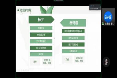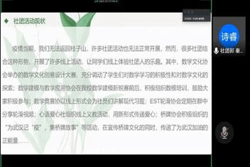 关于社团活动现状,秦诗睿结合当前形式将过去与现在的社团工作做了对比,并对社团外联工作的规范性开展提出了建议和要求。同时,他详细说明了学院在奖状、场地、人员、物资等方面能够给予各挂靠社团的帮助。随后,他总结了数统学院各挂靠社团在疫情期间举办的线上活动,并予以肯定。