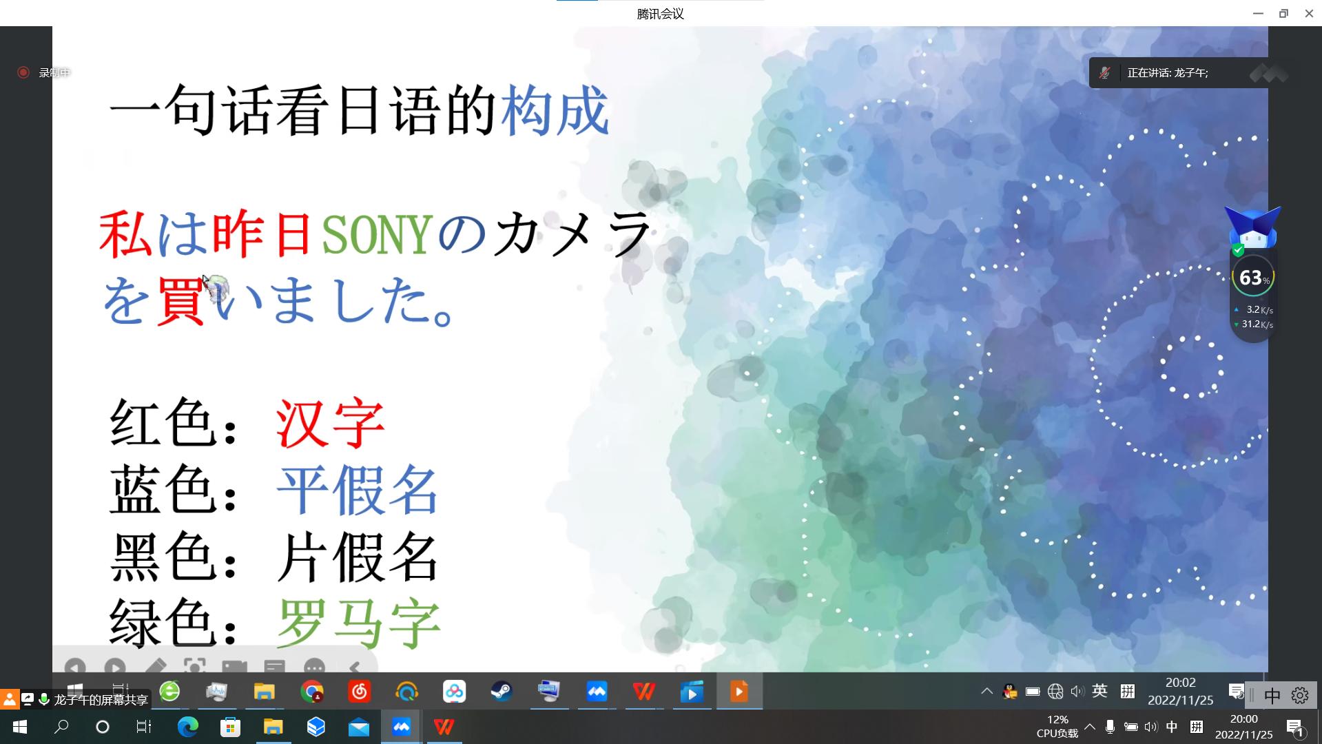 在授课的开始,龙子午简要介绍了构成日语书写和语音系统的汉字、假名、罗马字这三大组分,以及这三者的历史渊源。在第二部分,龙子午向会员们介绍和分析了五十音图以及假名的排列组合规律,随后在共享屏幕上带着会员们一起朗读词汇、书写假名,并通过认读假名小游戏进一步加深记忆。最后龙子午以简单易懂的语言讲述了假名背后的历史故事。