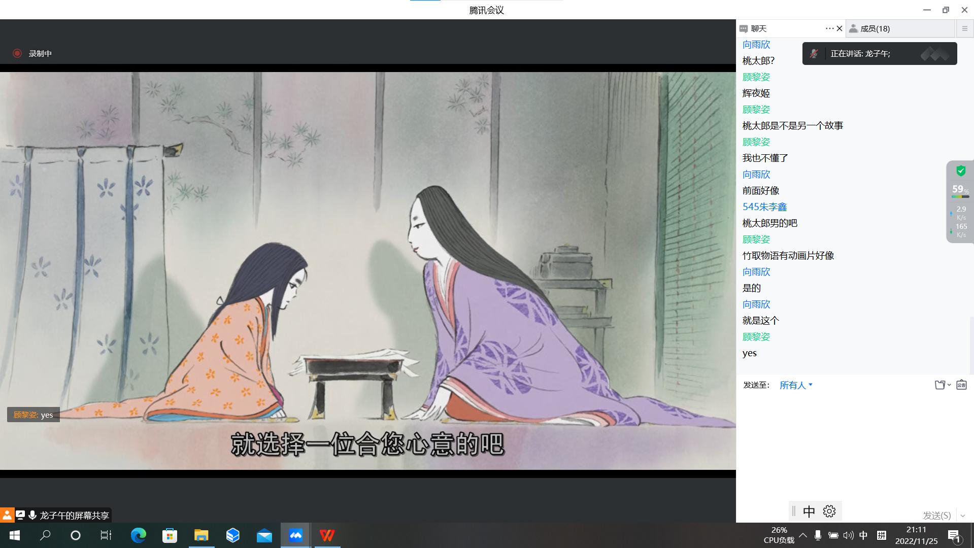 接下来,龙子午从日安、谢谢、抱歉等日常礼貌用语引入,进一步向与会成员们介绍了与日本礼仪相关的文化习惯,并鼓励会员们面对文化冲击时坚守正确的文化立场,秉持开放包容的态度。进入第四部分后,龙子午开始介绍日本民间传统故事。在简要介绍了竹取物语的故事梗概后,龙子午放映了影片《辉夜姬物语》的片段,向会员们展示了日本物语文学经久不衰的魅力。