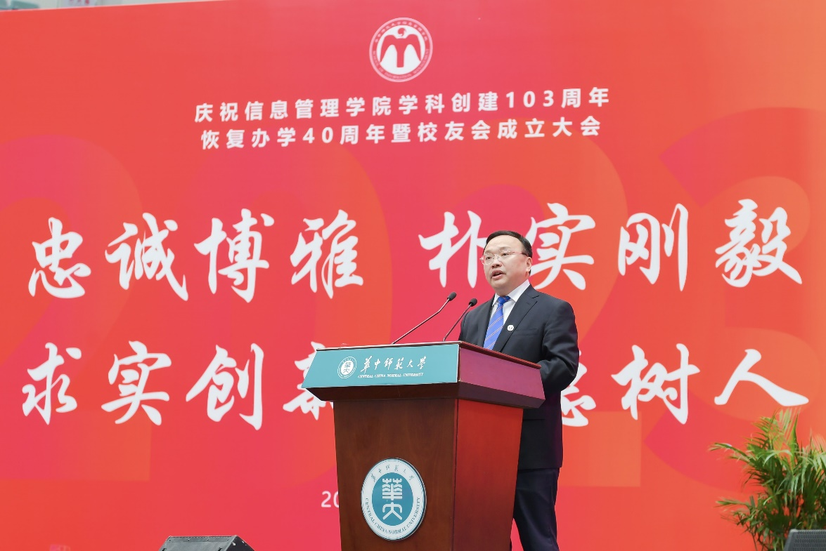 夏立新代表学校向信息管理学院学科创建103周年、恢复办学40周年暨校友会的成立表示祝贺,向关心和支持信息管理学院发展的友好单位和各界朋友表示感谢,向为学院发展做出卓越贡献的前辈致以敬意。在致辞中,他回顾了信息管理学院的办学历程,对一代代信管人自信自强、守正创新给予高度肯定。夏立新希望信息管理学院以本次庆典为契机,继续守正创新、不断奋进,结合自身学科专业特色,在高素质拔尖人才培养中实现新突破,在数字中国建设中体现新作为;希望信管校友会不忘初心,勇担使命,发挥桥梁纽带作用,汇聚智慧,拓展资源,凝聚合力,在展示华师人形象上有作为;希望所有信管校友胸怀大爱、勇毅前行,在工作中做出新贡献在事业上实现新发展,用实际行动诠释忠诚博雅、朴实刚毅的华师精神。