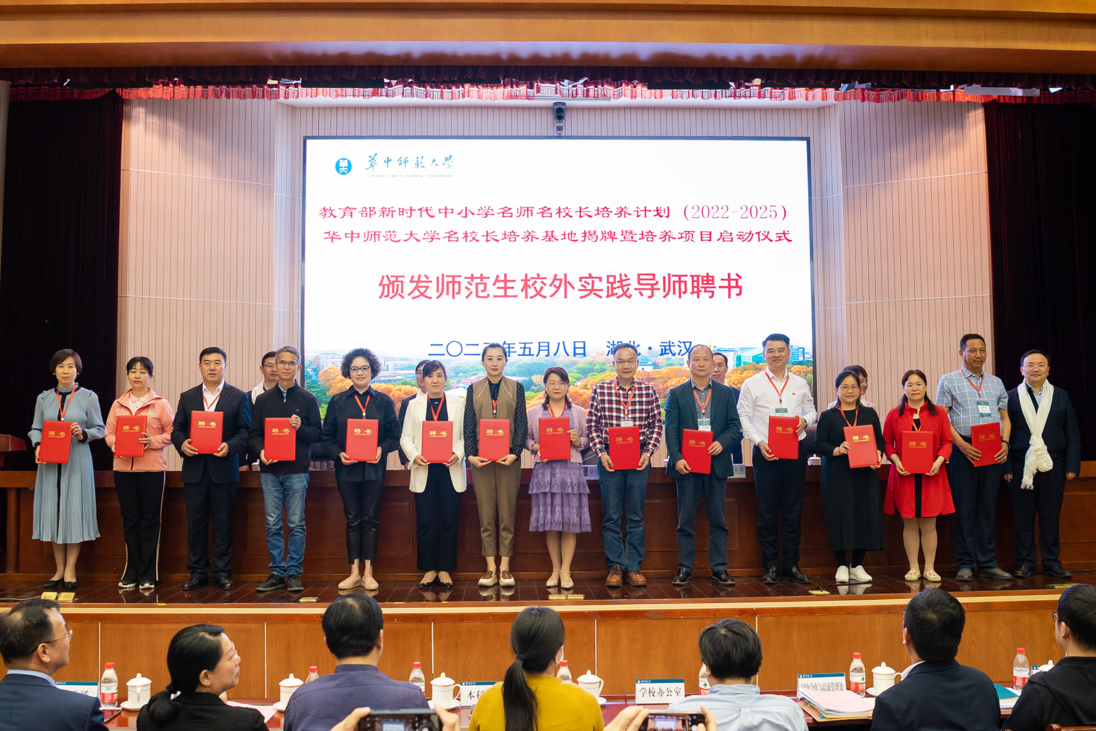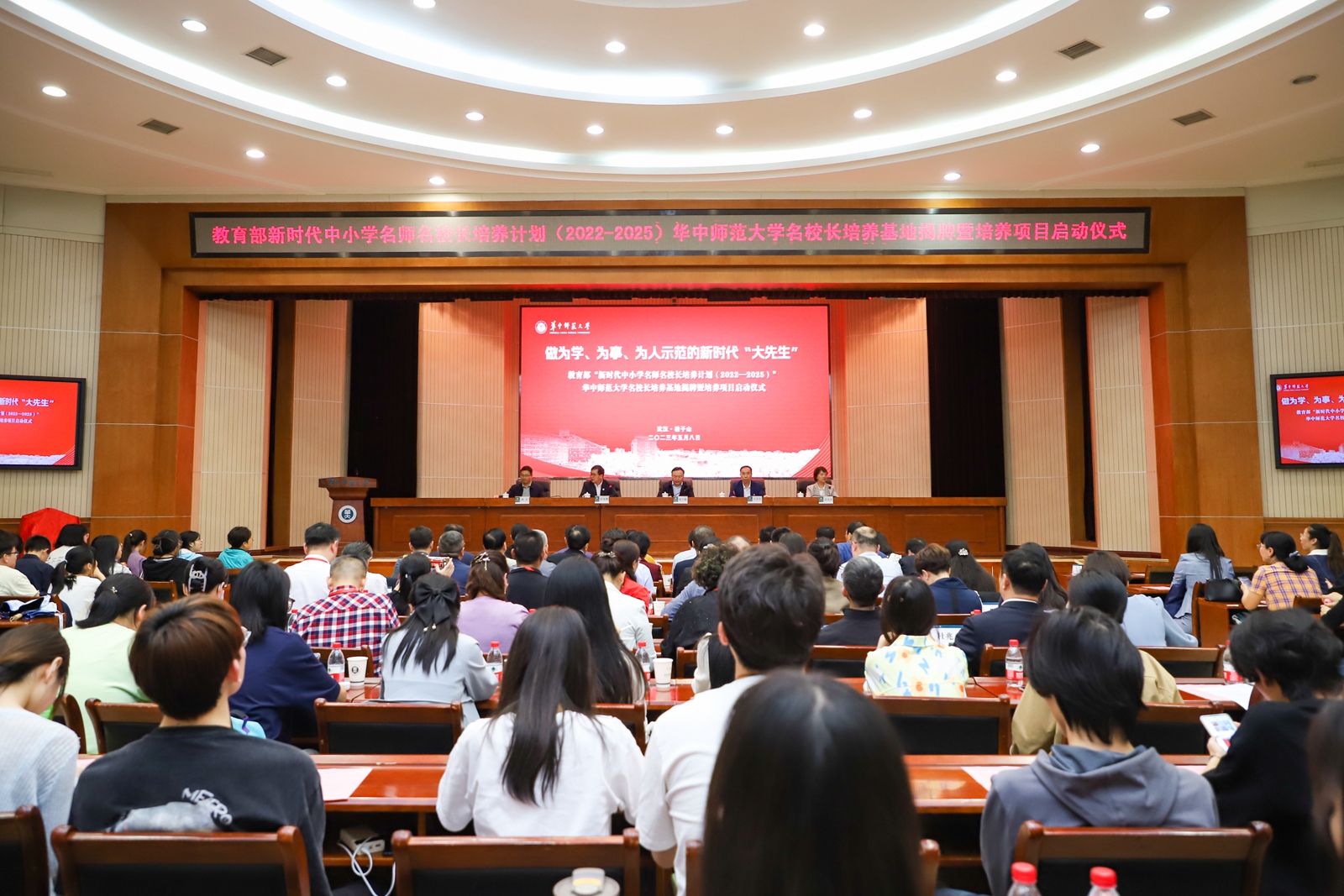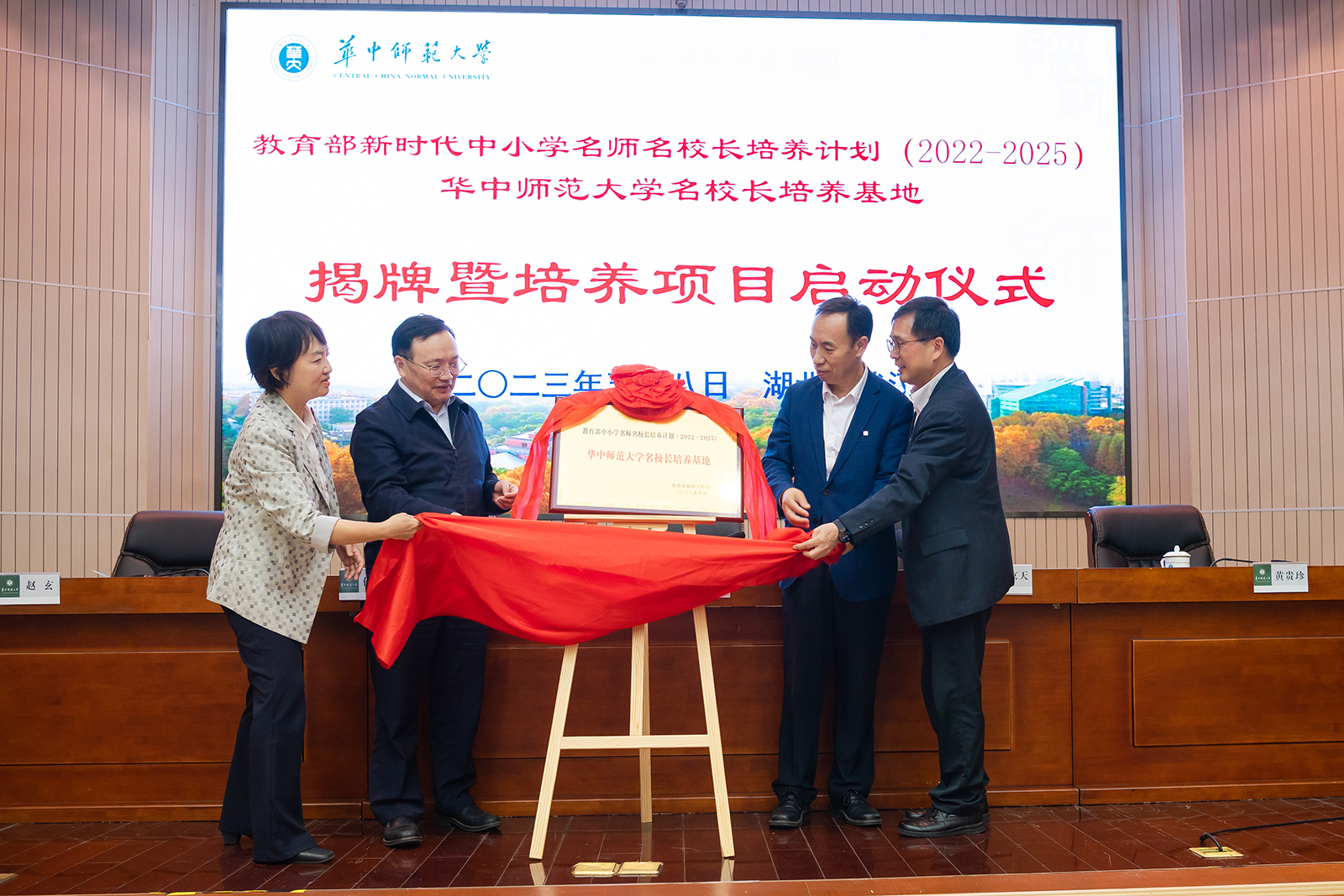 华大在线讯(记者 郝日虹)5月8日,教育部新时代中小学名师名校长培养计划(2022—2025)华中师范大学名校长培养基地揭牌暨培养项目启动仪式在科学会堂一楼报告厅举行。校党委书记夏立新、国家教育行政学院副院长于京天、教育部全国中小学教师校长培训专家工作组秘书处秘书长黄贵珍、中小学校长和幼儿园园长国家级培训项目管理办公室副主任赵玄出席。启动仪式由副校长任友洲主持。