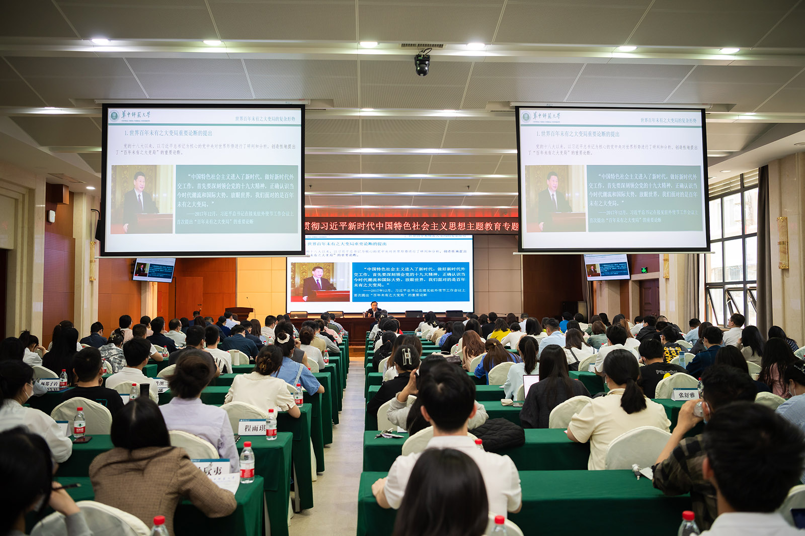 华大在线讯(记者 郝日虹)5月9日,我校学习贯彻习近平新时代中国特色社会主义思想主题教育专题党课在管理教育综合楼一楼103报告厅举行。校党委书记夏立新围绕“在百年变局中争做新时代有为青年”这一主题,为全体分党委副书记、辅导员代表、机关青年干部代表、学生党员代表讲专题党课,通过探讨世界百年未有之大变局下的“强国建设之问”“教育发展之问”“青年成长之问”,勉励青年师生肩负起时代赋予的伟大责任与历史使命,努力做有远见、有梦想、有抱负、有才华、有干劲的新时代有为青年。教育部直属高校主题教育第八巡回指导组刘国栋同志参加了本次党课。