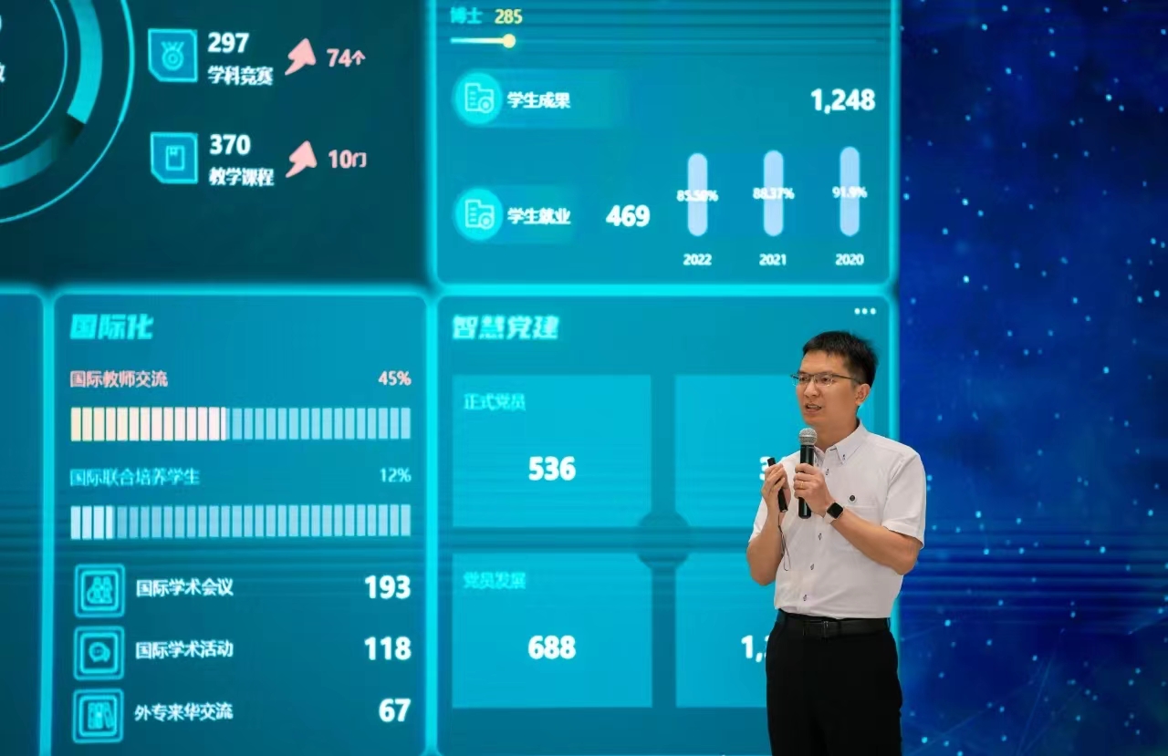 数字化助“管”,数据驱动,优化治理。自2018年荣获国家教学成果特等奖以来,学校不断深化成果应用,深入15个核心业务部门开展数据治理调研,梳理指标1200多个,可视化展示指标300多个,研发展示大屏17个,现已实现业务数据“一目了然”,校园场景“一贯到底”,辅助决策“一键生成”,突发事件“一线响应”,在推进数据驱动的学校治理模式变革方面,积累了诸多实践经验。