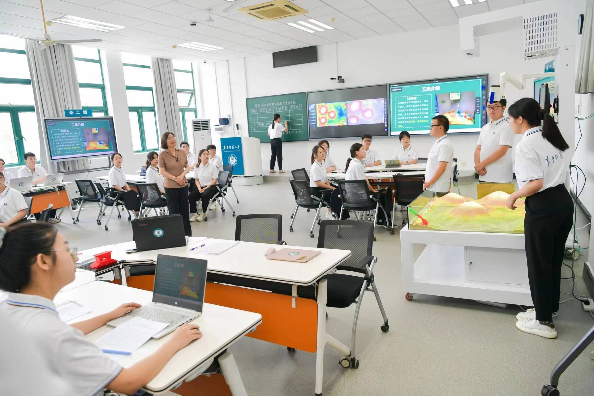 数字化助“教”,技术赋能,创新发展。《等高线地形图数字化教学资源开发》课程运用国家智慧教育平台上的国家级一流本科课程《现代信息技术与中学地理教学》资源,通过自主设计的虚拟仿真实验、地理AR沙盘等信息技术,让学生在这个“翻转课堂”上,更真实、更主动地进行地理教学技能训练。在《生物学教学技能训练》课堂上,同学们不仅可以依托“小雅平台”完成理论知识自学、模拟试讲和教学反思,还可以通过高校生物学教学论教师和一线高中生物学教师的“双师”协作指导,突破“问题链设计”这一教学难点。