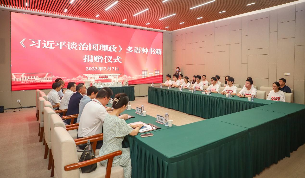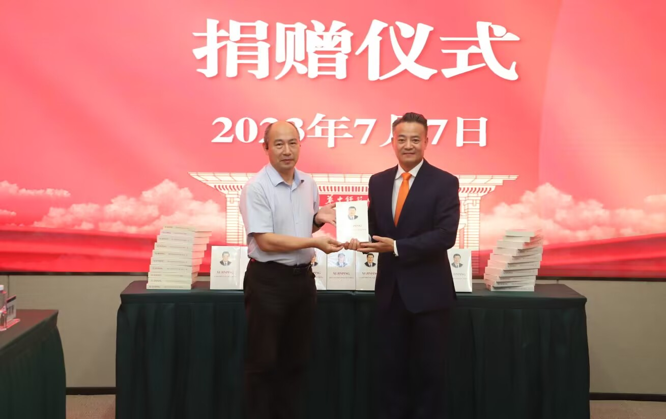 夏立新向北京崇学文化发展有限公司总经理余富文颁发捐赠证书并表达诚挚谢意。夏立新回顾了我校一百二十年的红色根脉,并表示,此次捐赠对全校师生深入学习贯彻习近平新时代中国特色社会主义思想、进一步推进学校主题教育深入开展具有重要意义。学校将发挥多语种学科和学术优势,深入研究、阐释、宣传《习近平谈治国理政》,为讲好中国故事、传播中国声音,贡献华师人的力量。