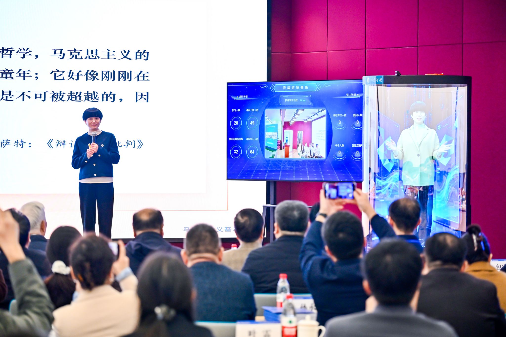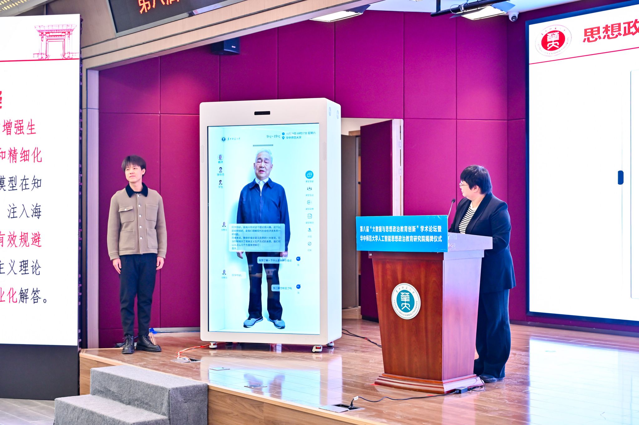 会上,研究院展示了“思政教育导师智能体”和“思政课教师智能体”。两款思想政治教育智能体分别以我国思想政治教育专业创始人之一的张耀灿教授和全国模范教师、我校马克思主义学院教师丁茜为原型,涵盖课堂答疑、课堂互动、课堂延伸、课堂随测等应用场景,旨在构建以思政教育导师智能体、思政课教师智能体、辅导员智能体、青年学生智能体为矩阵的全时段、全场景、全流程思想政治工作体系。