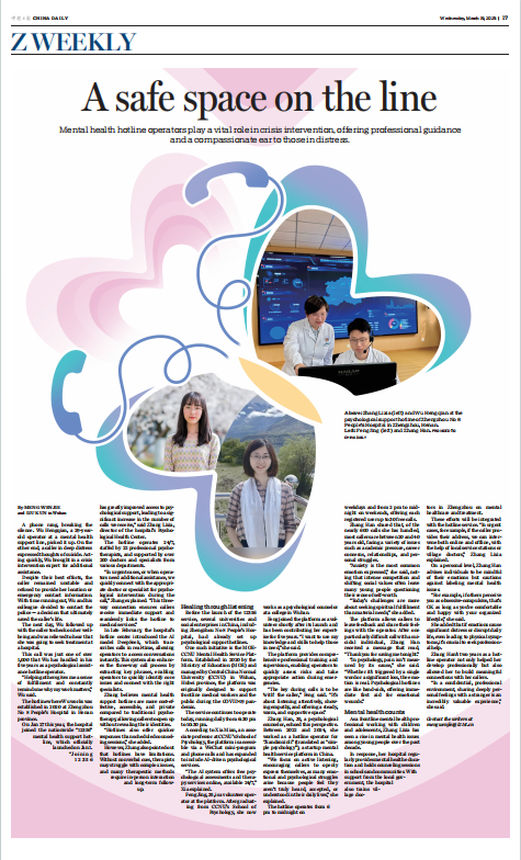 近日,《中国日报》(英文版)聚焦我校心理健康服务平台的创新实践与社会贡献,对其在心理援助领域的突出成效进行了深度报道。教育部华中师范大学心理援助热线平台自2020年成立以来,始终致力于为公众提供专业、便捷的心理支持服务。