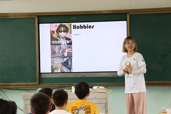 英语会话课中,队员张奕萱用图文并举的形式,囊括了自我介绍,相互问候,餐厅点菜等各类生活场景。通过击鼓传花等小游戏,她积极邀请同学们展示课堂所学。“最重要的是让他们大胆开口说”,结合具体语境,辅助以视频,绘本等材料,张奕萱鼓励同学们从英语原文中自主提取实用表达和万能句式,在理解的基础上现场应用。