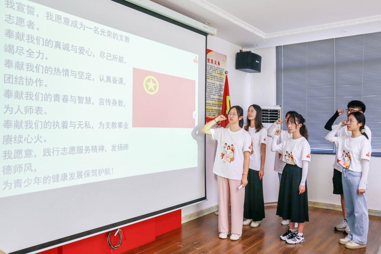 志愿者老师进行自我介绍以及集体宣誓。在铿锵有力的宣誓声中,志愿者老师坚定了无私奉献、认真教学的信念,铭记了自身的义务与责任。