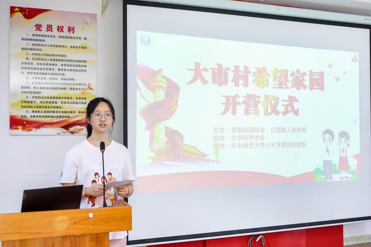 华大青年讯(通讯员 张艺恬 肖扬 黎环 雷雅淋)7月10日至11日,华中师范大学外国语学院心火支教团白霓队(以下简称“白霓队”)希望家园开营仪式在白霓镇大市村、金龙村和三溪村举行。本次开营仪式由崇阳县团县委、白霓镇人民政府主办,各村村委会协办,华中师范大学外国语学院心火支教团白霓队承办。