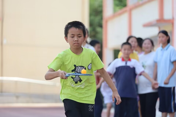 此外,“百发百中”“鼎力相助”和“赶猪跑”三个项目更是考验着同学们的团队合作能力,展现着少年的风采与活力。在合作接力运球比赛中,同学们用羽毛球拍运着乒乓球小心行进,在保证平稳的同时追求速度。此时,同学们的平衡力、速度、定力在此一一展示。加油的同学也都屏气凝神,生怕他们的声音扰乱选手的节奏,直到选手运球结束,赛场上才发出此起彼伏的欢呼声。