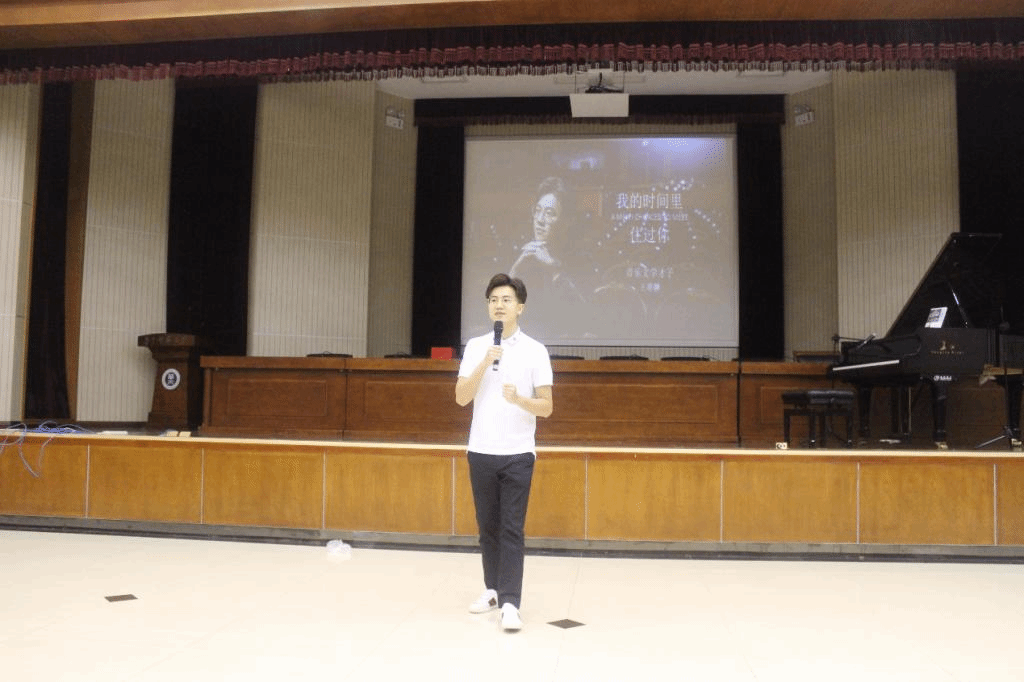 王希翀学长在分享会开始之初做了简要的自我介绍,然后以一段美妙的钢琴曲独奏开始了他的分享。学长先分享了自己当年在华师的经历,他认为大学才是一个人梦开始的地方——我们在进入大学的那一刻,我们开始了自己的生活,不仅仅是学习,我们还有了自己的小圈子……王希翀学长的音乐梦也是从大学开始的,从第一部动画电影配乐的完成,到接到北京江平导演的电话,再到第一次成功参与电影《康定情歌》配乐,学长的音乐梦一点一点走向现实。学长还送给我们一句话:“大学并不是意味着抛开书本,放飞自我,大学是一个自我塑造的开始,他也决定着你今后会成为怎样的人。”