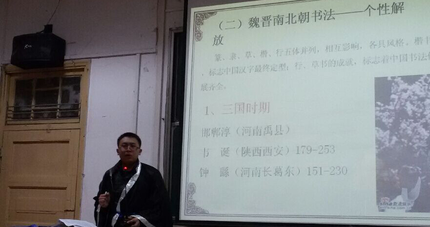 华大青年讯(通讯员 郭艺佳)12月12日晚,诗书礼乐大讲堂第三期于1201教室开讲,本次讲堂主题为“无声的诗,无图的画——中国书法”,主讲人王奕鹏为我校历史文化学院中国古代史专业硕士研究生,曾获春晖史学奖学金和优秀毕业生称号,并于去年以专业第一名的优异成绩保送本校读研。当晚他身着汉服,以通俗易懂、幽默诙谐的语言引领同学们进入到书法艺术的殿堂。