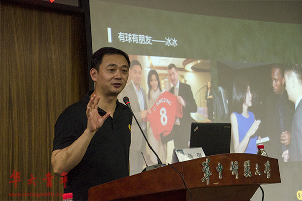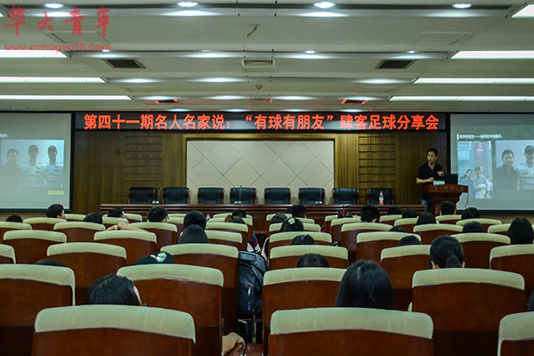 华大青年讯(见习记者 郑淑琴 杨泊之 见习摄影 张诗琪 李思童)5月16日晚,第四十一期名人名家说在逸夫国际会议中心举行。本次活动由共青团华中师范大学委员会主办,社科处副处长刘中兴,校团委组宣部部长王涛,绿茵足球社指导老师李凯出席活动。本期讲座主讲嘉宾为肆客体育创始人颜强,他结合自己在体育行业工作多年的经历与同学们进行分享交流。