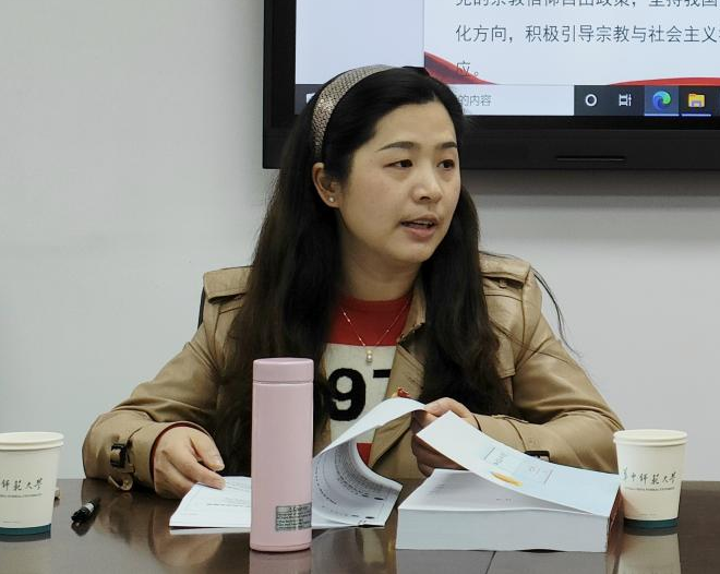 本次党日活动包括三项议程。首先,麻旎同志领学习近平总书记在2021年全国宗教会议上的讲话精神。麻旎同志指出,在理论层面,我们应深刻认识中国特色社会主义宗教理论的本质要义,要完整准确领会和贯彻新时代党的宗教工作和方针政策;在实践层面,对于身边有宗教信仰的老师同学,我们要给予充分的尊重,既保护信教群众宗教信仰自由权利,也耐心细致做好信教群众工作。