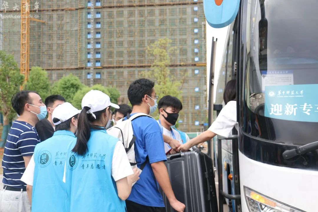 在志愿者的指引帮助下,新山民们有序排队、依次乘车。一辆辆摆渡车在校园内往来行进,为疫情防控背景下新生的校区内通行与物资搬运提供安全便捷的解决方案。