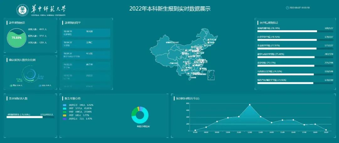 据悉,此次新生入学工作充分利用信息技术,打造“2022年本科生报到实时数据展示”系统,使学生的报到注册情况可监测、可量化、可跟进,助力相关工作高效开展。
