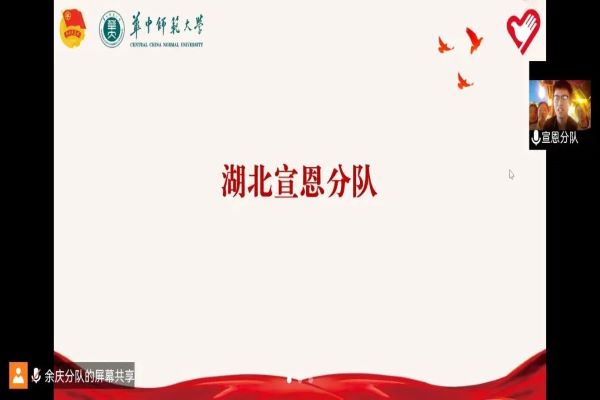 校团委副书记胡余映为研支团的成员们送上了节日祝福,详细询问了各地的生活工作情况。胡余映指出,各分队在抵达服务地不足两个月的时间中,充分传承华师研支团的优良传统,积极发挥服务社会、辐射青年的组织效能,开展了一系列社会实践与志愿服务活动,同时面对繁重的教育教学工作也能良好地胜任,希望各分队成员们能够继续保持热情与初心,工作顺利,平安健康。