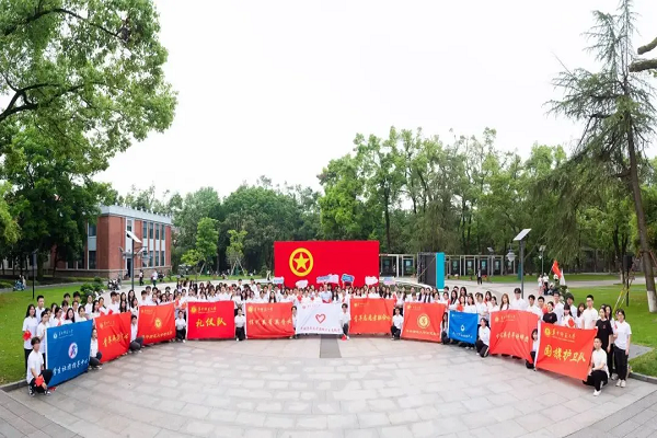 在喷泉广场,各学部学院(所、中心)、校级学生组织代表参加“我与团旗合个影”活动,和领导、师长一道,在团旗的见证下印刻青春光影。此活动自4月29日开始至5月5日结束,共持续7天。