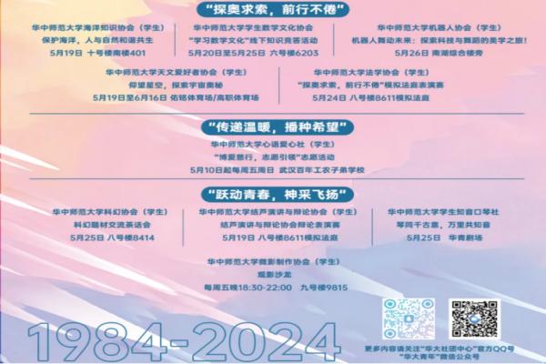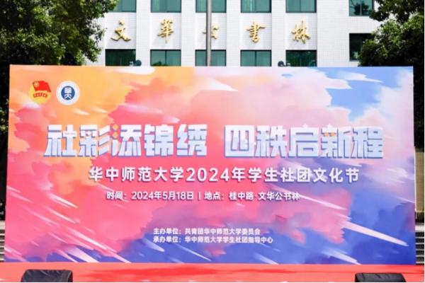 华大青年讯(文字 丁蕊 罗雪萍 周应瑛 闫弈梦 摄影 蔡涵蕊 孙懿德 齐晓莹 温耀昕 杨靓 曾于珊)为进一步落实立德树人根本任务,营造积极向上、活泼生动的校园文化氛围,充分发挥社团在人才培养中的重要作用,使学生在“第二课堂”中持续提升自我,庆祝华中师范大学学生社团指导中心(前身为社团联合会)成立四十周年,5月18日,由共青团华中师范大学委员会主办,华中师范大学学生社团指导中心承办的“社彩添锦绣,四秩启新程”华中师范大学2024年学生社团文化节在桂中路、文华公书林举行。