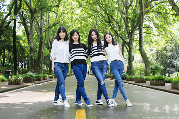 在桂中路的树影碎阳下,四个好姐妹都身穿白色或条纹上衣加牛仔裤,风格统一,连照相机前的小羞涩和拒绝在宿舍采访的理由也一致,画风十分和谐。然而四年前的她们,却是性格爱好各异,各有特点,用她们的话来说,这都是“磨合了四年”的结果。