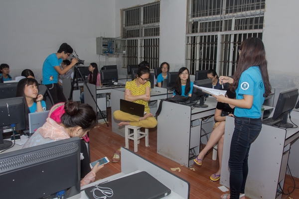 晚饭过后,采访团的成员便在敦厚中学一角的机房集中。同行的计算机学院学生帮忙在这里接上了无线网,整支队伍的写稿任务便在这里展开。“大家先汇报、分享今天的采访成果,然后将各自的采访内容梳理成文。”王子宇站在机房的讲台边发言,队员们却看似有些注意力不集中。