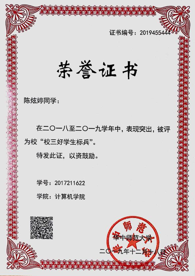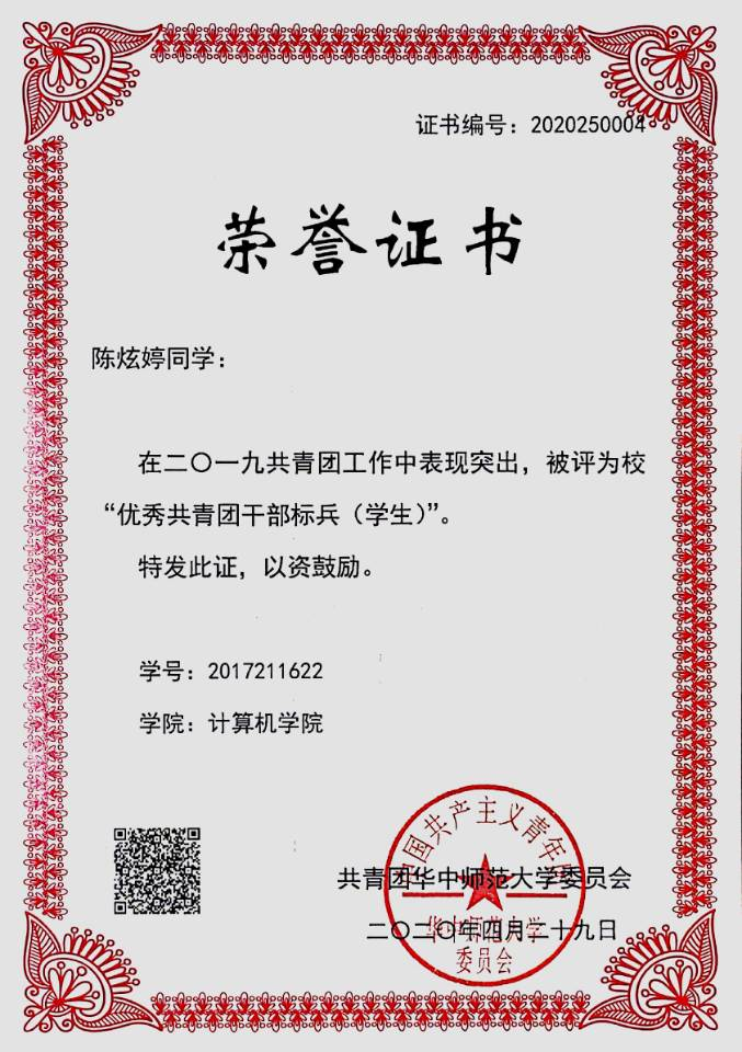 华大青年讯(记者 王一好)陈炫婷,女,华中师范大学计算机学院计算机科学与技术专业2017级本科生,中共预备党员。曾任计算机学院团委副书记,现保研至复旦大学计算机学院。连续三年综合成绩排名1/131,荣获2020年度“校长奖学金”,连续两年获得“国家奖学金”。荣获校“三好学生标兵”、校“优秀共青团干部标兵”等称号。主持或参与国家大学生创新创业项目等4项科研项目,荣获2019中国机器人大赛全国一等奖、第十三届中国大学生计算机设计大赛全国三等奖等20项省级以上奖项。以第一作者发表学术期刊论文一篇,第一作者申请软件著作权四项。
