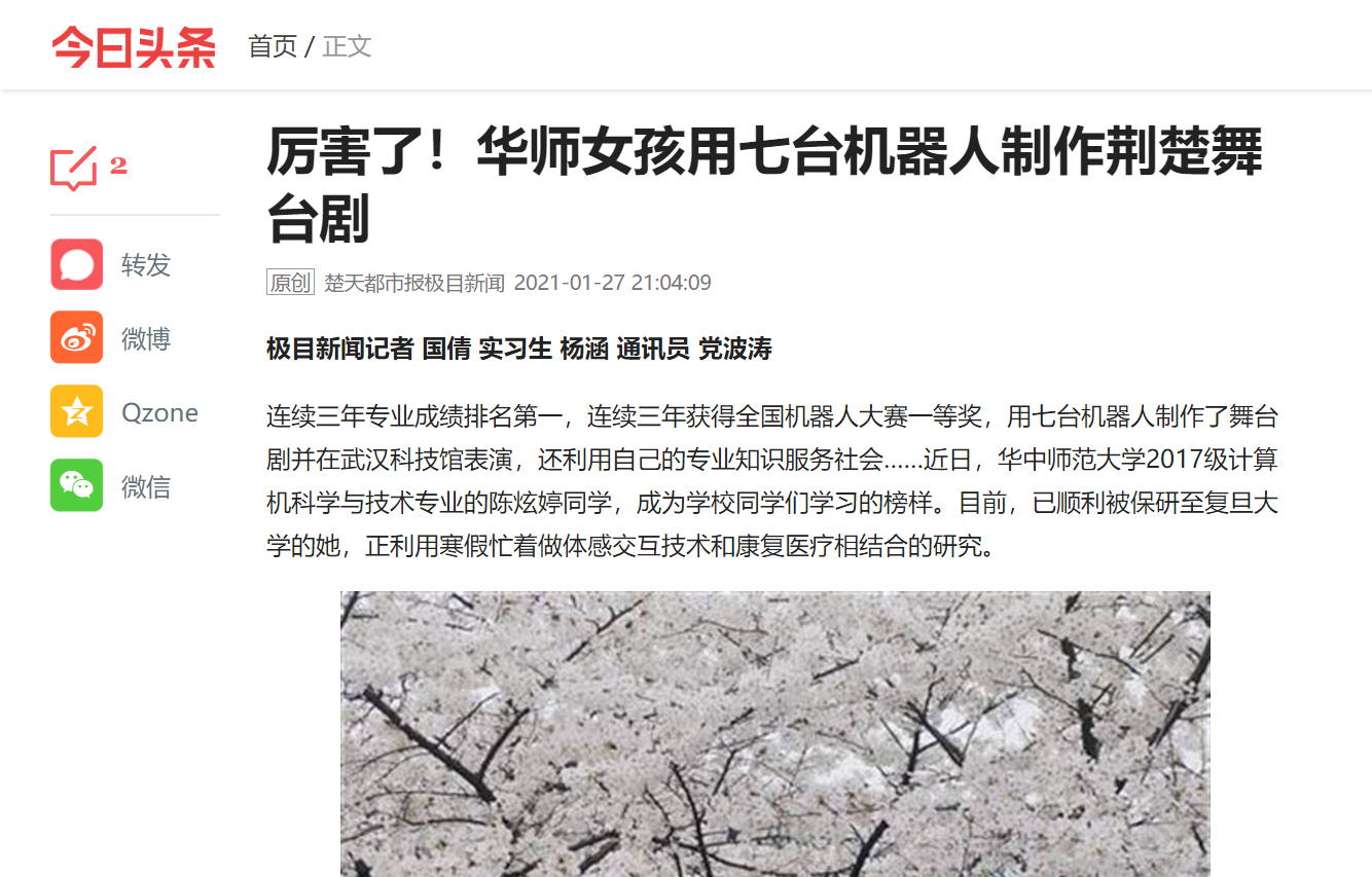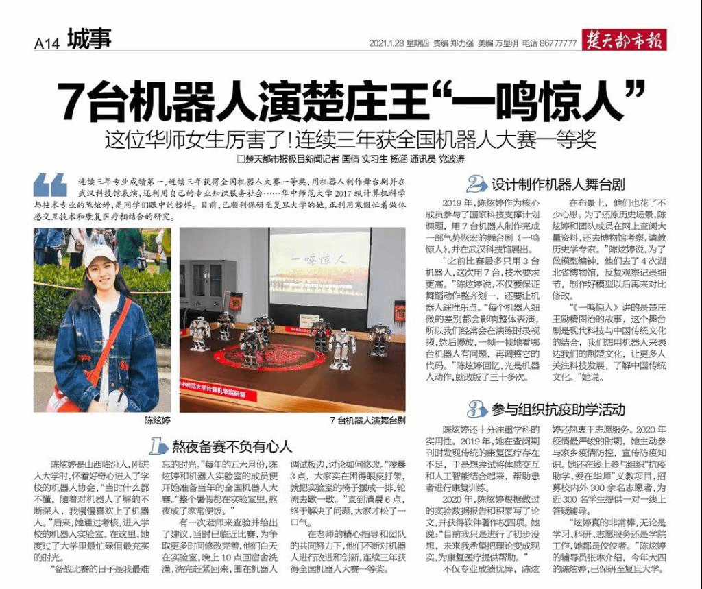 2019年,陈炫婷作为核心成员参与了国家科技支撑计划课题,用7台机器人制作完成了一部气势恢宏的机器人舞台剧《一鸣惊人》,并在武汉科技馆展出。从筹备到最终在武汉科技馆表演,他们一共耗时6个多月,最终获得了良好反响和广泛关注。