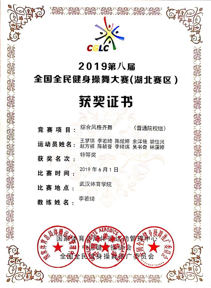 陈炫婷还加入了华大艺术团舞团,多次参加校内外大型文艺活动,并在第八届全国全民健身操舞大赛中,荣获湖北赛区“综合风格齐舞特等奖”,获得校“文艺活动积极分子”、华大艺术团“优秀团员”等。