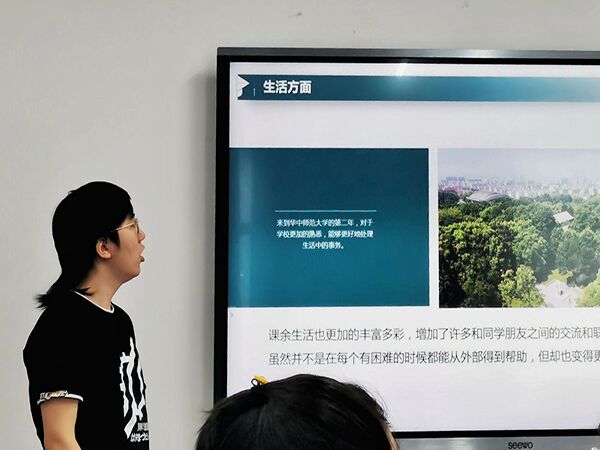 李浩然作为第一位上台的同学,从学习、生活、反思三个方面进行经验分享。他认为:“课后学习尤为重要,课堂上没学懂的知识一定要通过课后学习理解清楚;同时,与小组成员合作也是学习中重要的一环。”上一学年,李浩然积极参与五四青春诗会、师范生技能比赛等活动,给自己安排了丰富多彩的课余生活。最后,他反思了因自制力不足、得过且过的态度对课程学习和校园生活所带来的消极影响,为在座同学们的新学期学习打了一剂预防针。