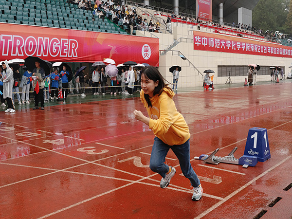 下雨没有阻止运动会的进行。每一位运动员都按时到场进行检录,没有人因为天气而退缩。她们在起跑线处活动筋骨,调整呼吸,希望能赛出水平。一声枪响后,女子400米比赛正式开始。物院女子运动员在雨中奋力奔跑,挥洒汗水,坚持不懈,勇往直前。