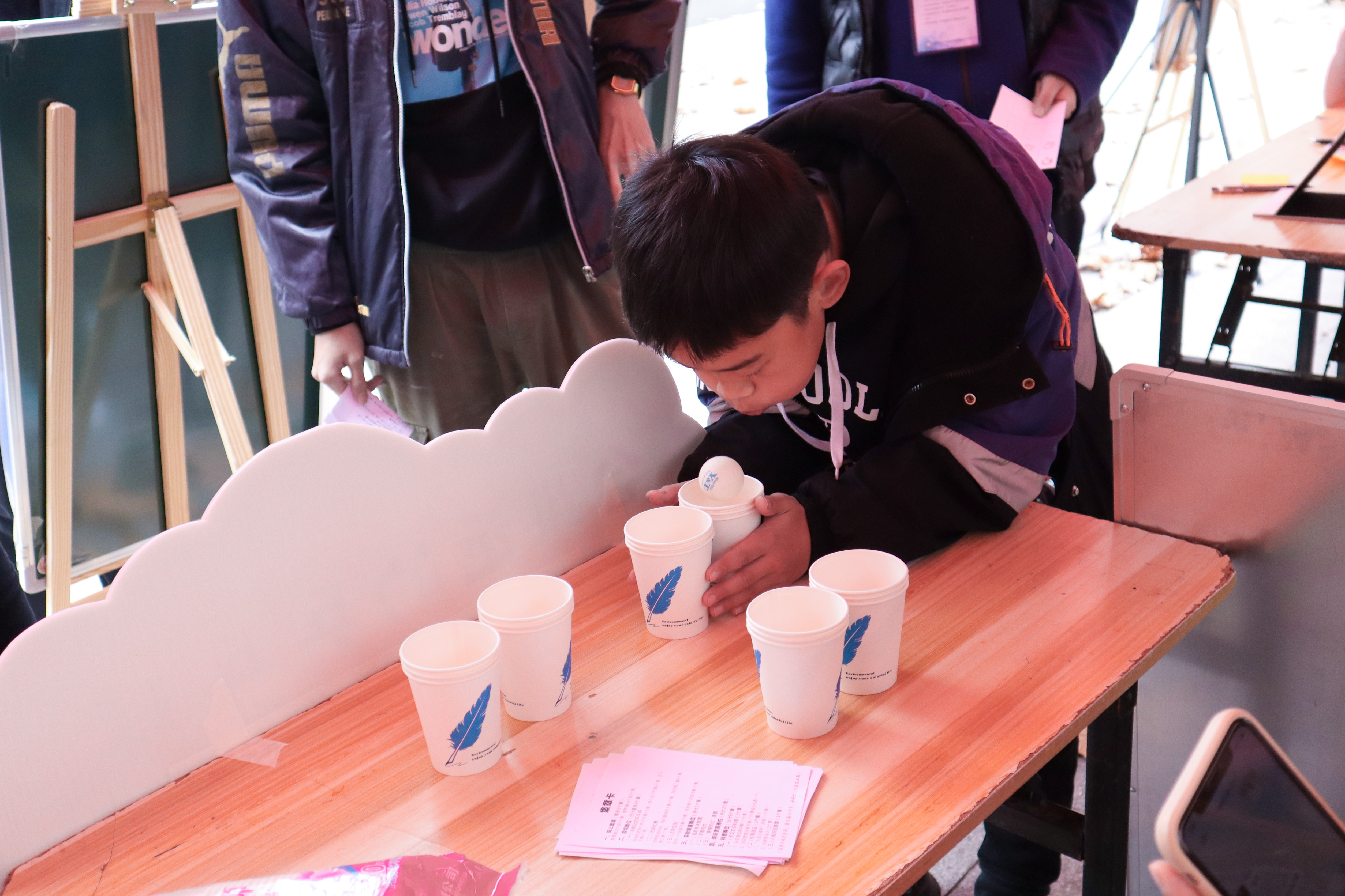 会“跳远”的乒乓球,这个小游戏中包含的物理知识可不少。对着乒乓球的上方吹气,球上方的压力变小,下方压力变大,乒乓球就会升高,最后才能成功“跳”出去;运球过程中运用到牛顿定律。一个个藏在乒乓球游戏中的物理原理,在日常生活中也有所体现,启发同学们细心观察生活中的现象,鼓励他们多思考,多探索。工作人员引导同学们体验温差发电装置、手蓄电池、“穿墙而过“装置,并通过细致讲解,使同学们更深入地了解了装置背后的物理原理。