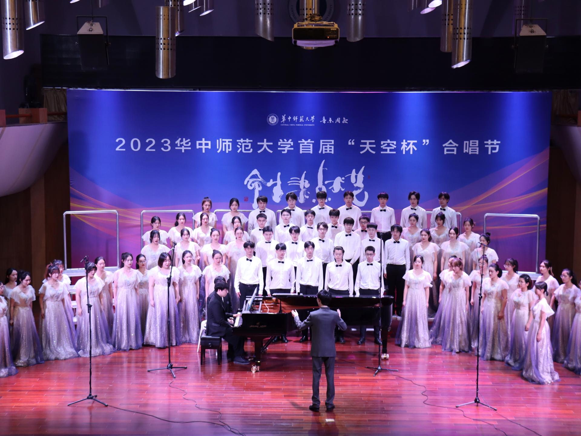 在经济与工商管理学院的经音合唱团演出结束后,物院泛音合唱团入场,裙摆上星点闪耀,西装上撒满了夺目的灯光。他们按照独特的位置站定,调整状态,准备演出。同时,来自音乐学院的指挥陈子奇,钢琴伴奏赵锦彬身着正装在既定位置准备就绪后,待音乐厅中的掌声平息下来,他们开始了精彩的表演。