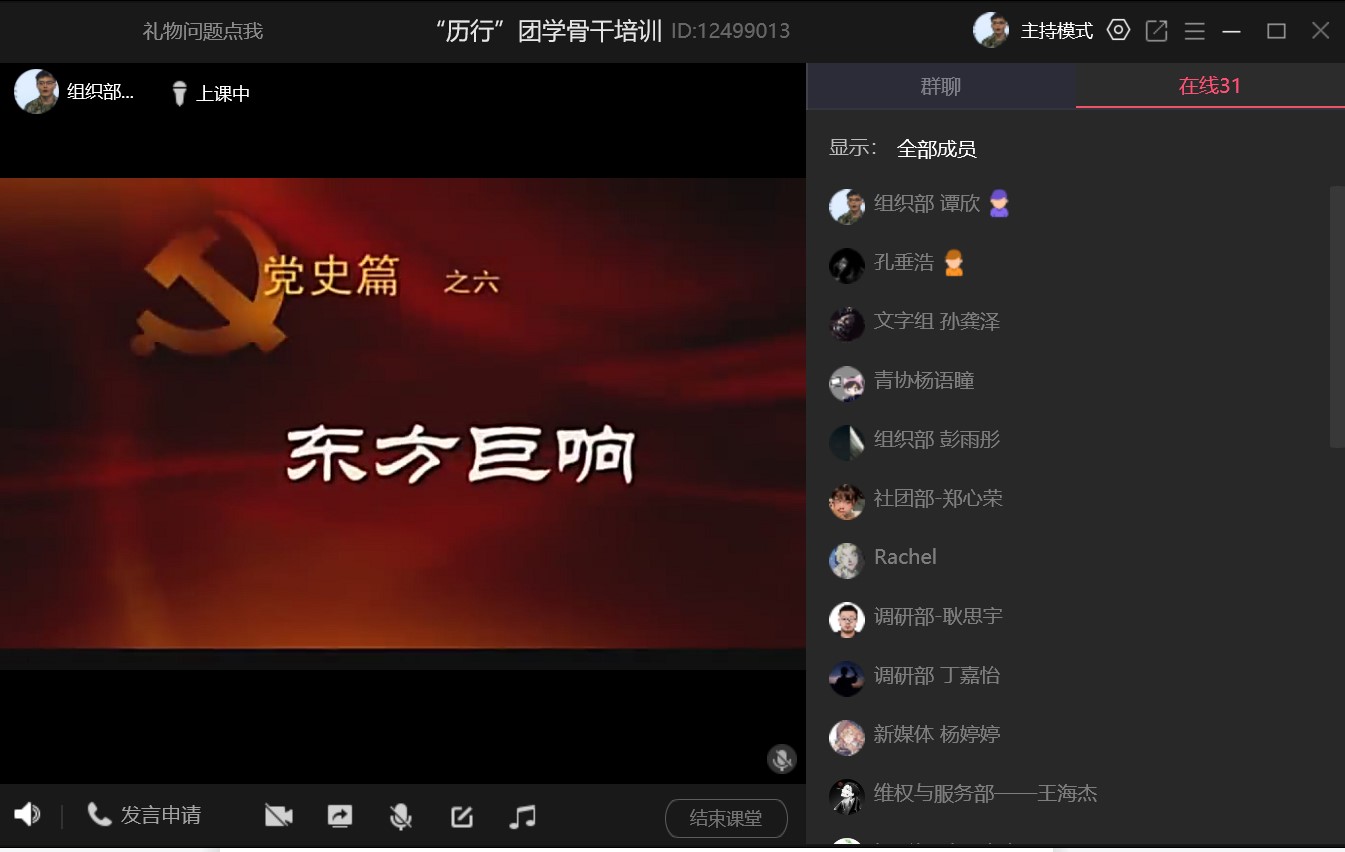 华大青年讯(通讯员 陈星余)8月5日晚,历史文化学院(以下简称“历院”)2021年“历行”团学骨干训练营一期培训第一次课程于腾讯群课堂举行。活动由历院团委组织部主办,面向2021届团委学生会新任部门负责人,并将“党史教育”融入培训内容,切实做到学史明理、学史增信、学史崇德、学史力行,学党史、悟思想、办实事、开新局。本次课程由团委副书记孔垂浩主持,以“以史为鉴,经世致用”为主题,通过观看党史纪录片,让团学骨干切实感受波澜壮阔的百年历程,历久弥坚的百年初心。