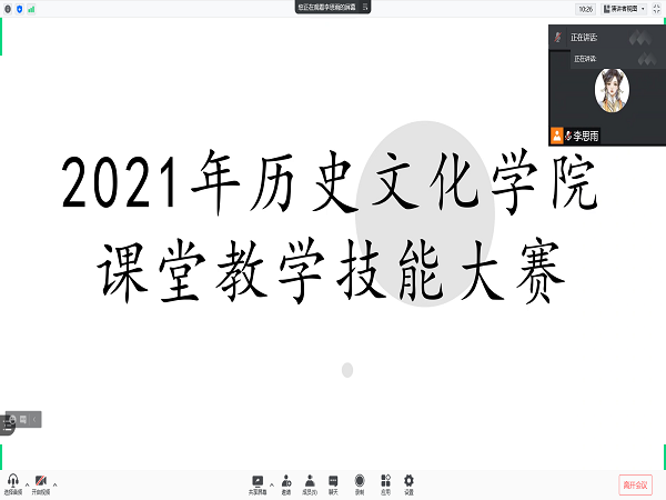 华大青年讯(通讯员 蔡雨倩)9月11日下午,历史文化学院(以下简称“历院”)课堂教学技能大赛于腾讯会议举行。此次比赛围绕教学技能展开,旨在加强师范生实践能力培养,促进师范生综合素质和教育教学能力的提升。本次活动由共青团华中师范大学历史文化学院委员会主办,历院中学历史课程与教学论教师向佐军、2019级辅导员秦玉琴、本科生兼职辅导员付佳琪以及本科生兼职辅导员、研究生团委副书记高成龙担任评委嘉宾,历院学生会副主席李思雨担任主持人。经过评委打分,本次比赛中朱璇、卜聪盈荣获一等奖,吕承瑶、李佳霖、杨虹荣获二等奖,张丽芹、任星雨、黄子豪、白菲菲荣获三等奖。