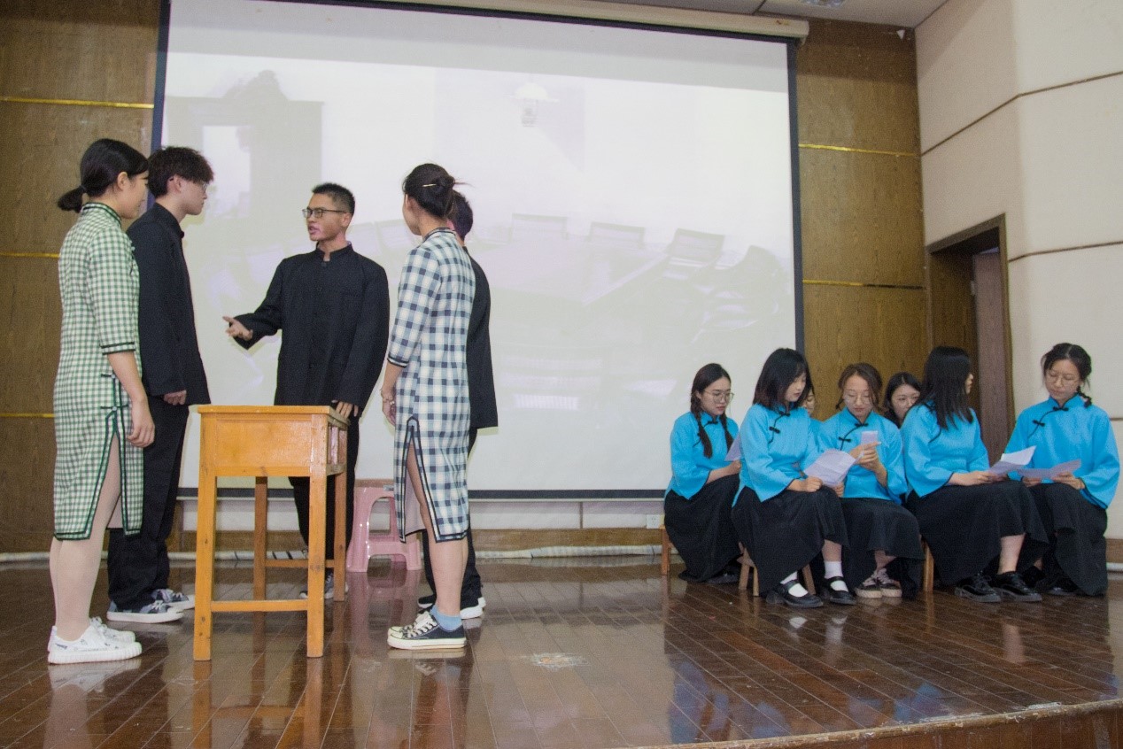 表演继续进行,2003班将班级精神风貌分为了“爱·为人师”、“技·为人师”、“知·为人师”、“活·为人师”四个板块,并用小品《以少年之名》和歌曲《少年的你》来表达对老师们的祝福。19级的苏婕雅先是介绍了师范生集体概况,然后从师范生技能比赛、专业考察、科研立项三个维度阐述了19级师范生集体建设的情况。紧接着,1901、1902、1903班的同学倾情演绎了小品《百年华大、师魂永驻》。该节目以华中师范大学百年校史变迁为背景,以师魂为线索,展现出了薪火相传、代代相继、永不息止的华师之风。