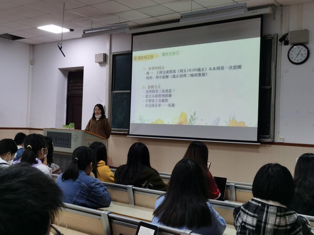 首先,院团委副书记孔垂浩从总体上介绍了本次会议的主要内容。他主要从青年大学习和团日活动开展两个方面对各团支书展开培训,进一步明确了活动的开展时间、材料格式等相关要求。他特别强调青年大学习的重要性,并提醒各新任团支书认真履职,细致开展工作,切实做到为同学们服务,打造积极主动、规范有序的团支部集体。