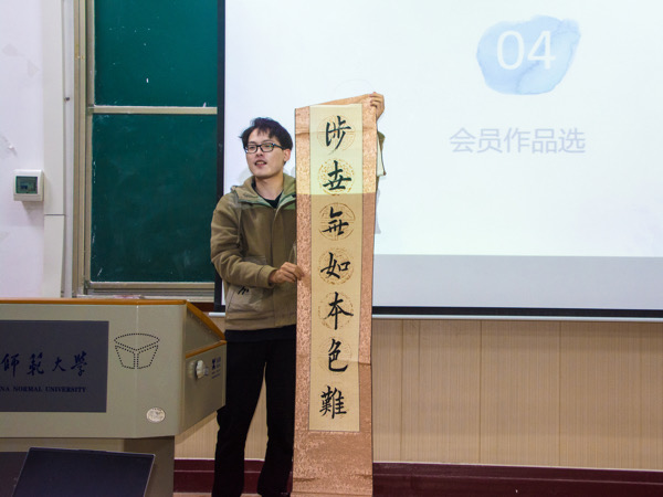 随后,田晨旭介绍了书画协会的社团特色、社团活动情况以及社团高校交流情况,接着他展示了优秀成员的书法作品,并为学生们发放了精美的书法作品书签,现场惊叹连连。尤克里里协会是一个温馨的大家庭,本着欢乐、团结、进取的宗旨,一切为成员服务。在侯明庆简单介绍了协会的情况后,两位成员带来了尤克里里弹唱表演,悠扬的旋律回荡在教室的每一个角落。伴随着优美的音乐,本次分享会走向尾声。
