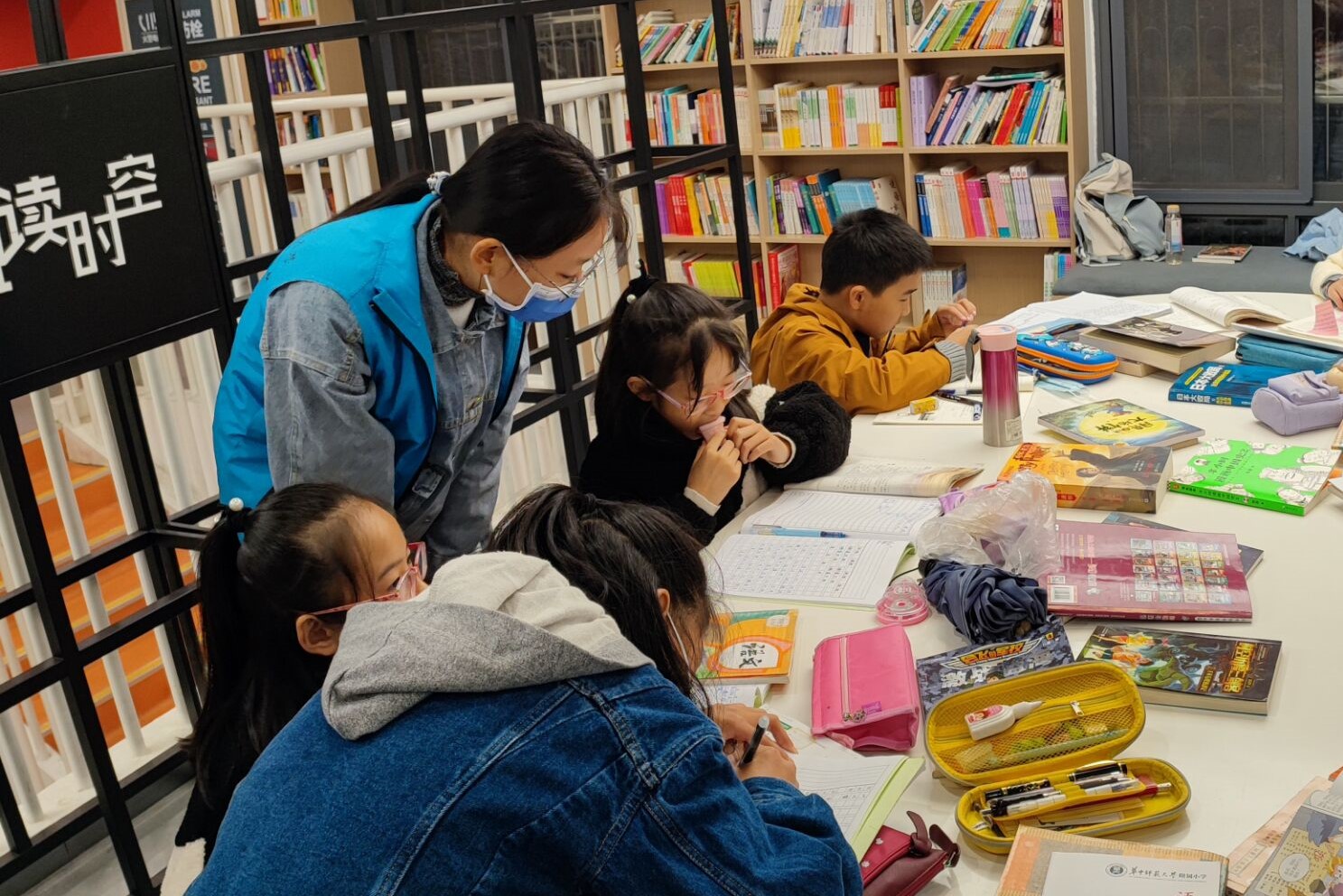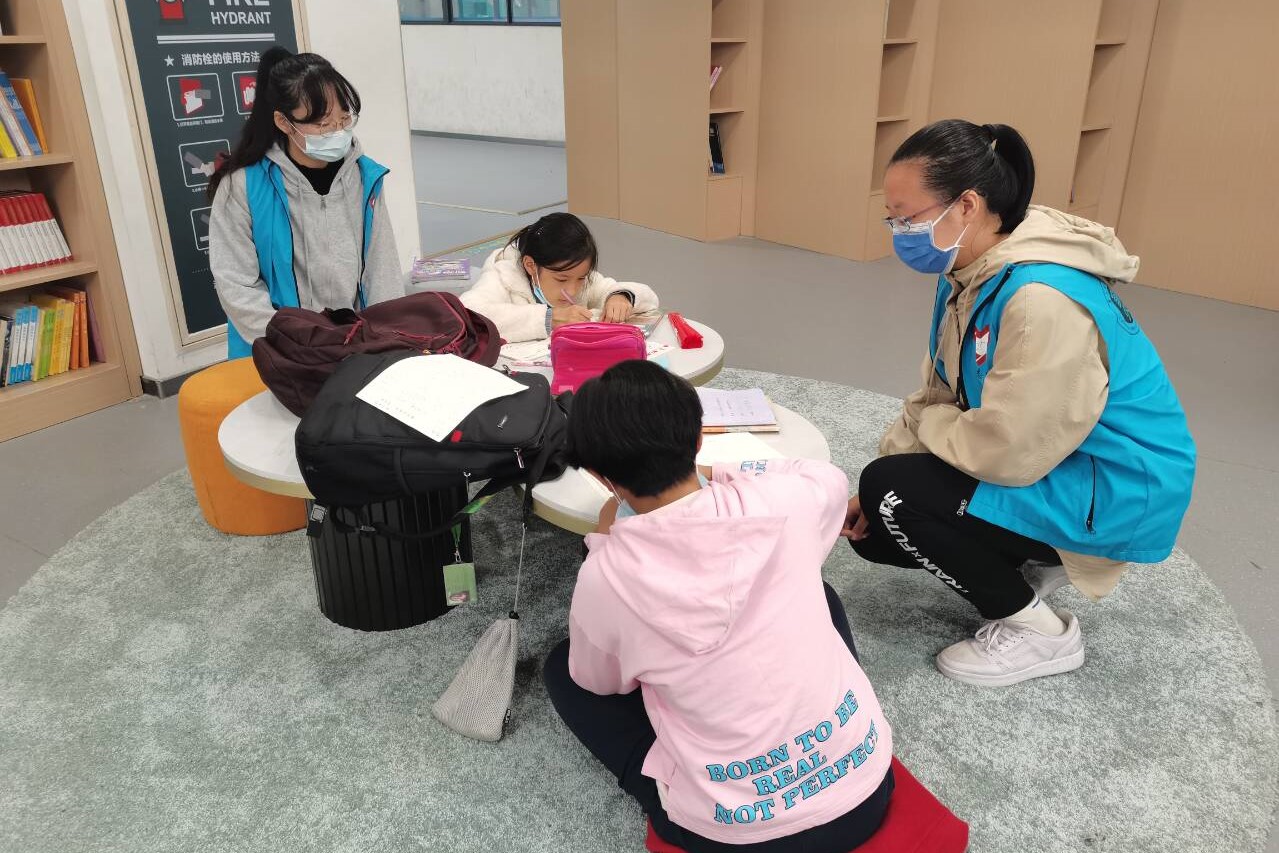 当学生们开始自习时,志愿者提醒学生优先完成课后作业。面对他们提出的不同问题,志愿者都一一解答,并且帮助学生进行英语词语听写。此外,志愿者还跟进学生课后作业自习情况,并引导他们主动思考作业中遇到的问题,培养其独立思考的习惯。空闲之时,志愿者还帮助学生们整理了一些凌乱的书籍,来保持桌面的整洁。