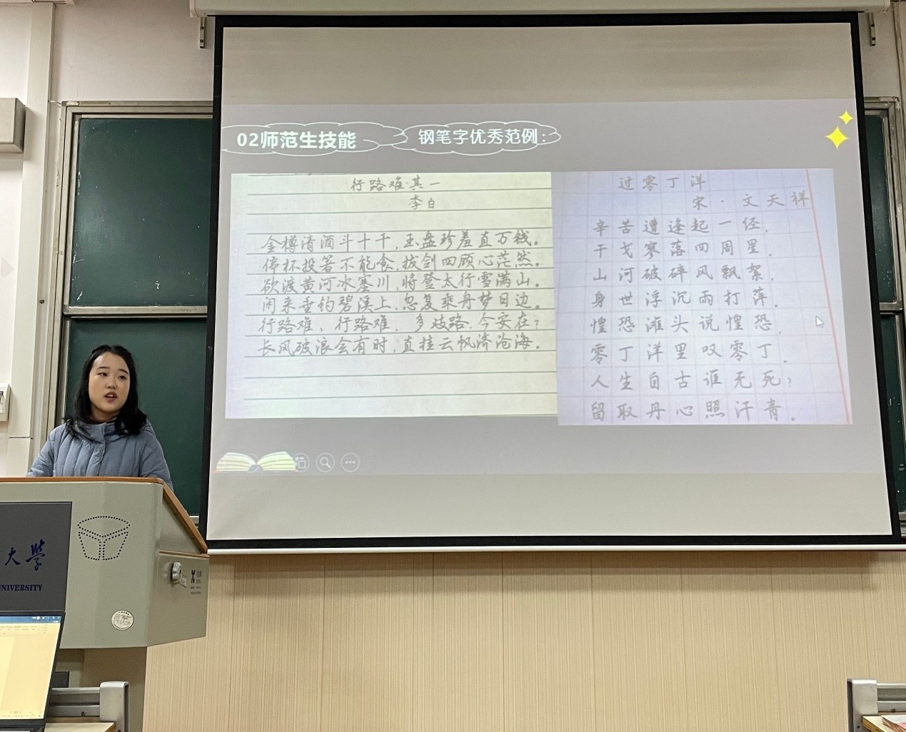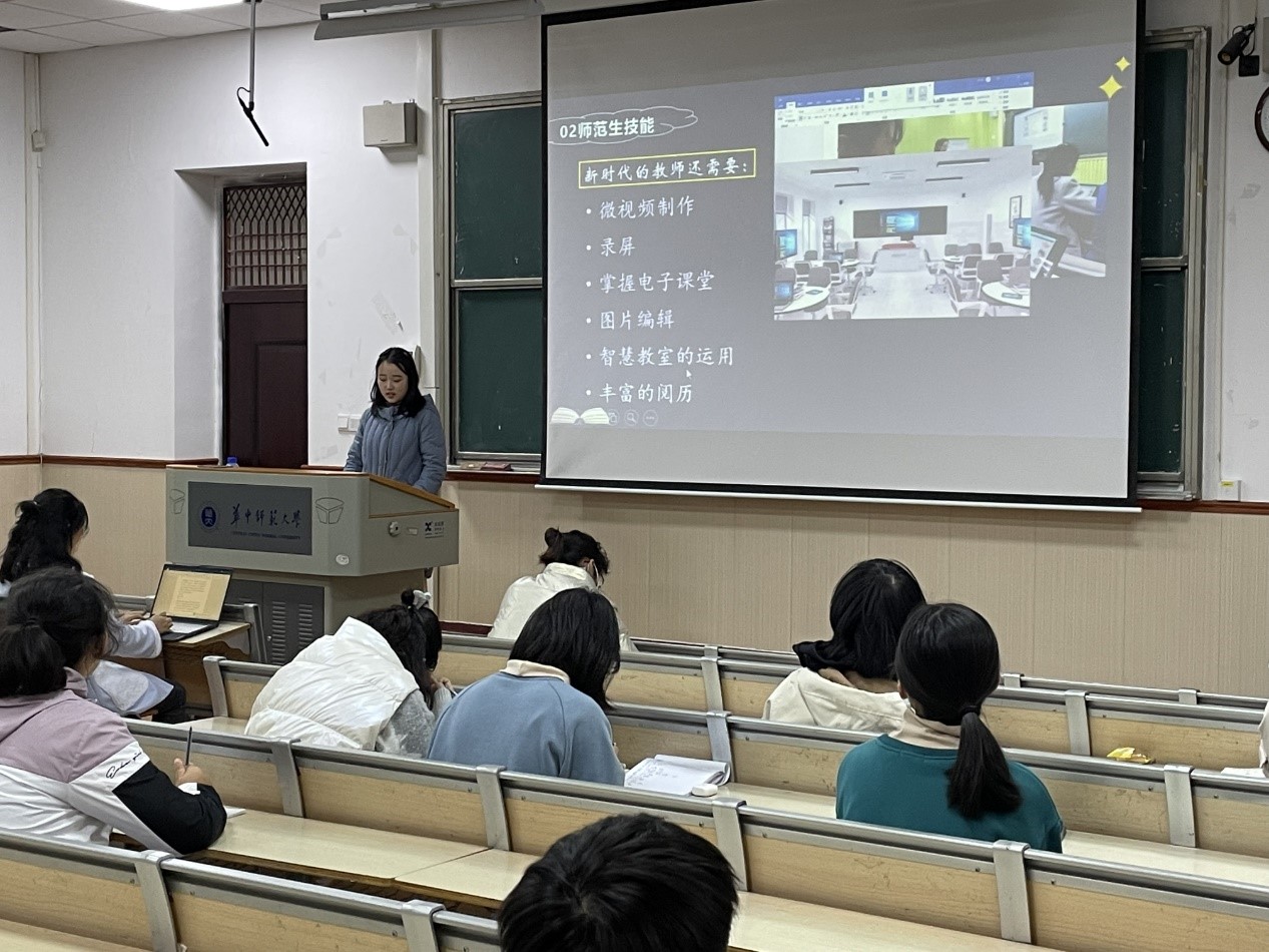 在师范生技能环节中,任星雨介绍了钢笔字、PPT制作、普通话、教学设计、粉笔字板书、讲课六项师范生必备技能,并向学子展示了优秀的钢笔字、粉笔字板书范例,详细介绍了师范生的普通话要求、考试和考试例题。在谈到新时代教师的要求时,任星雨强调了师范生应提高对微视频制作、录屏、电子课堂、图片编辑和智慧教室运用的熟练程度。在提醒学生丰富阅历的重要性后,任星雨讲述了一位湖南初中历史老师将新软件希沃融入授课过程的案例,这种全新的上课方式使学生对新时代师范生的要求有了更明确的认识。