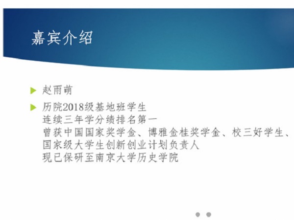 赵雨萌对于如何选题分享了自己的见解:要具有兴趣性、优势性和具体性。通过阅读对材料产生兴趣后,兴趣就会转化为动力。赵雨萌分享了寻找学术兴趣的“三读”法:读学术著作、读史料、结合时事。同时她提出要批判性阅读、以批判性眼光看待前人的研究以及保持对于当下时事的敏感度。此外,她还分享了自己写学术论文的小方法,即“大处着眼,小处着手”,写学术论文先从把小问题讲好和把小问题讲清楚开始,再慢慢形成宏大的历史观。