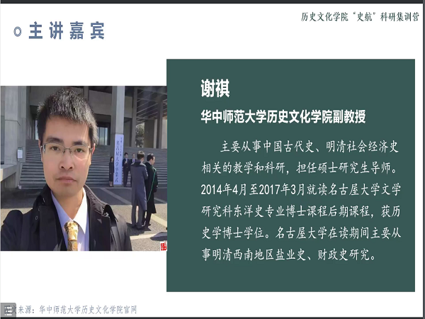 5月29日上午,历史文化学院“史航”科研集训营第四期活动于腾讯会议线上举行,旨在为学生撰写史学论文提供方法指导和训练。本次活动由“历行”学习发展中心、历院学科部、历院本科2019级创新创业部主办,邀请了历院副教授谢祺主讲。来自历院本科2019级创新创业部的李思雨担任本次活动主持人。