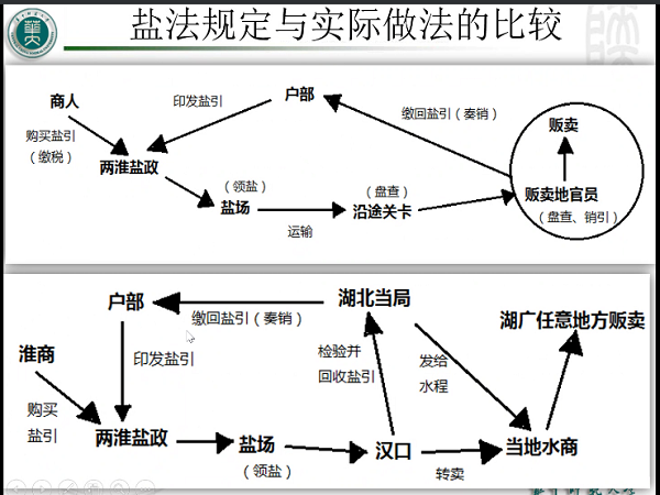 在常用的史料中,谢祺指出类书、方志的查找难度最小。在政书史料的使用中,谢祺以“清代前期食盐专卖制度与地方的制度执行”为例,为在线学子示范如何运用史料来梳理清代前期食盐运输、销售的流程。同时他结合实际,以“火车票”类比“盐引”,并展出流程示意图,便于学生理解。在整体总结清代食盐贩卖制度后,谢祺从四川私盐侵入湖广的事件入手,展现法律规定和实际操作之间的差别,体现了历史事件的复杂性。
